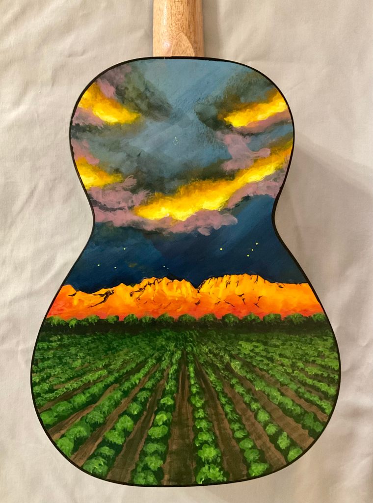 Las Cruces Ukes Charter Member Marie Hughey paints a special ukulele each year, which is finished by Chief Musical Officer boB Hull. This year, Marie has focused on the beauty of the Mesilla Valley where we are located and the drama of the night sky. One lucky winner will be the owner of this one-of-a-kind piece of musical art.
