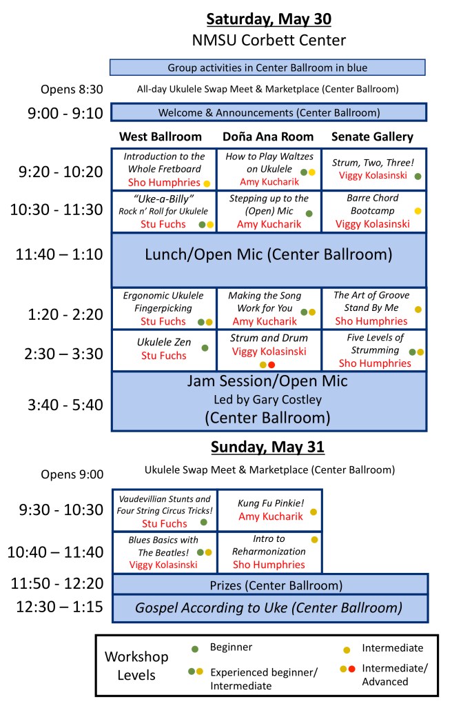 Here’s the schedule for the 2026 Las Cruces UkeFest. It is filled with lots of fun ukulele workshops with our four fantastic instructors. We’re using color coding this year to identify the difficulty levels of the classes: